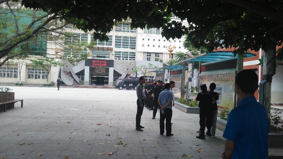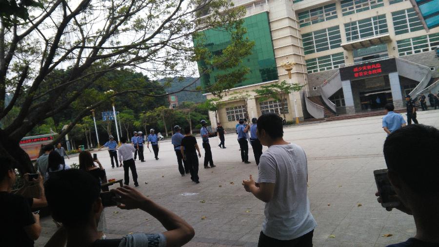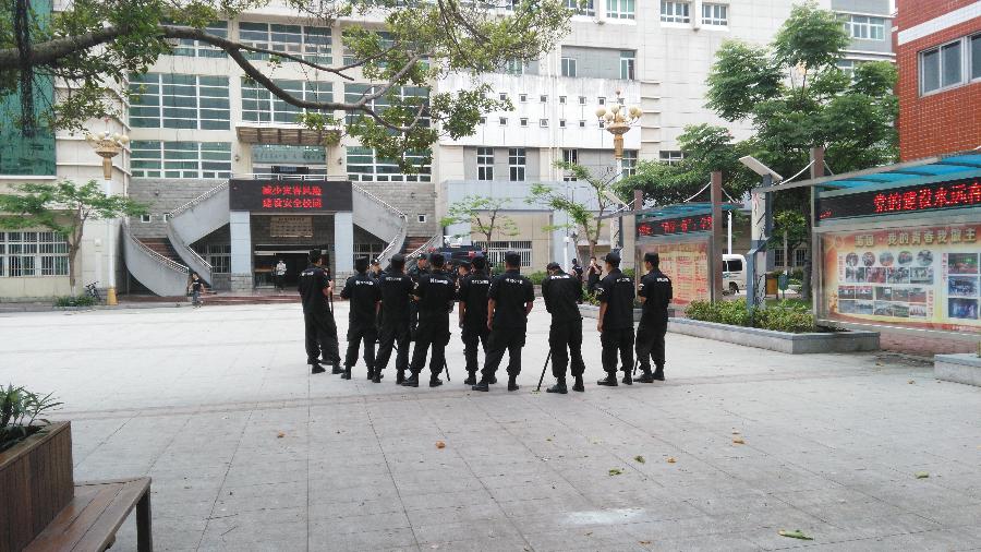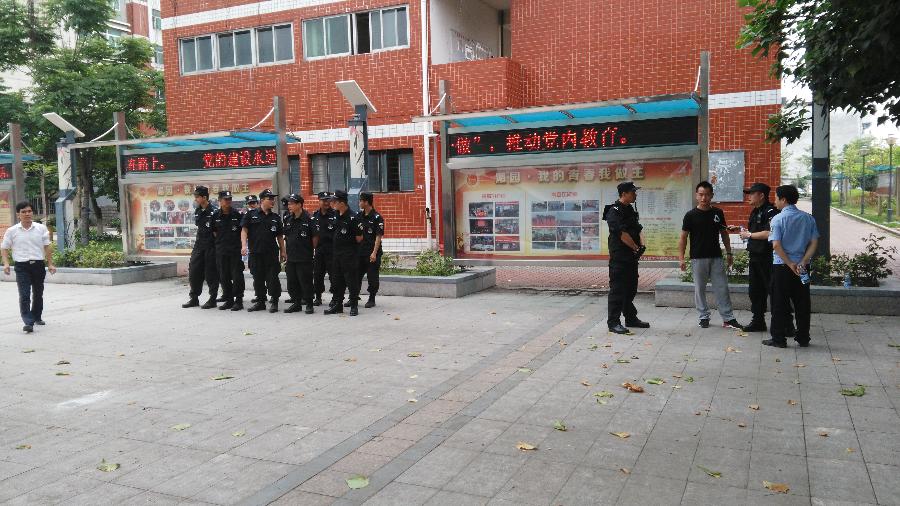 2015年5月20日早9:00,反恐演练【预演】于图书馆广场开展,演练由保卫科长主持。