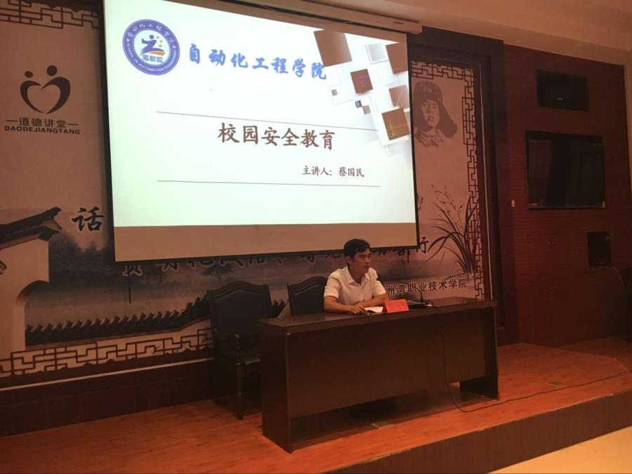 9月5日上午8:00,自动化工程学院“校园安全讲座”主题讲座于图书馆会议室成功举办。湄洲湾职业技术学院安保科科长蔡国民为我系生各班级班长做了一场内容丰富、生动详实的校园安全规范教育讲座。蔡科长从大学生的身边小事讲起,以大学生学习生活中的生动鲜明的案例,让同学们了解身边的安全隐患、注意事项、预防和处理方法。蔡科长从消防安全、防盗、防骗、个人安全等与大学生息息相关的内容入手,通过真实的事例叙述,归纳总结校园安全规范的要点。蔡科长的讲座,让同学们真切的感受到安全规范对我们大学生健康成长的重要意义,在此之前,从来没有想过安全隐患会出现在自己身边,也没有足够的重视,但是今天听了一个个鲜活的案例,让同学们警醒了,一定将今天学习的内容通过班会等形式向同学们传达,提高同学们的安全规范意识”。伴随着讲座的结束,2016年校园安全教育活动月圆满落幕。
