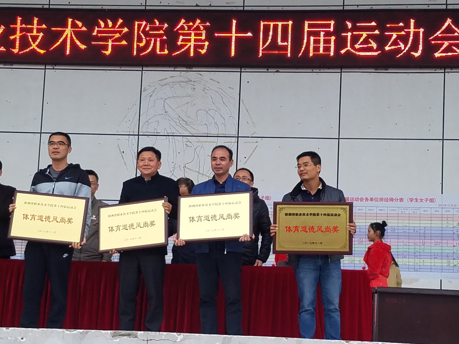 在庄严雄壮的集合号令声中,湄职院第十三届校运动会闭幕式正式开始,随之,副院长陈金毓报告了本次运动会的比赛成绩,并宣布各个院系获得的奖项,我系荣获体育道德风尚奖,并由主席台上就坐的领导们给获奖的教工团体和学生团体以及个人颁奖。随后,由副院长黄雅敏致闭幕词,黄雅敏副院长对获奖团体及个人表示了祝贺,感谢两天天来的每个工作人员的付出和努力。并且对此次运动会中展现出来的团队协作、超越自我和更高、更强的的体育精神强调点明。也提到此次运动会展示了我校师生的体育运动水平,并建议将赛场上顽强拼搏的精神带到学习中去。