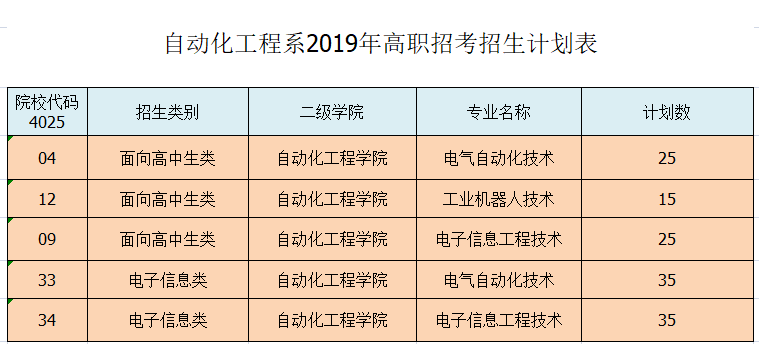 自动化工程系2019年高职招考招生计划