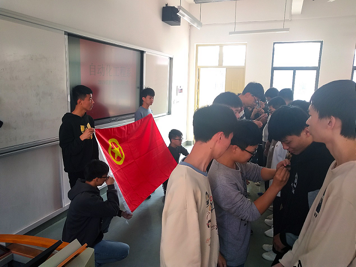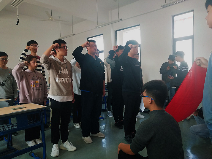 分团委副书记黄晓宣读新团员名单并祝贺新团员能够加入共青团这个大家庭,老团员代表为新团员佩戴团徽,在团旗的见证下,李胜斌带领新团员进行入团宣誓。