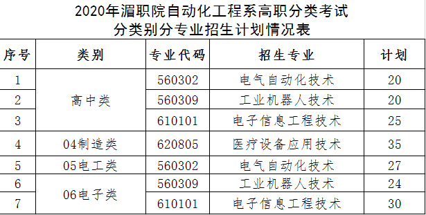 2020年湄职院自动化工程系高职分类考试分类别分专业招生计划情况表