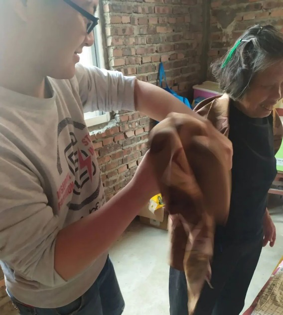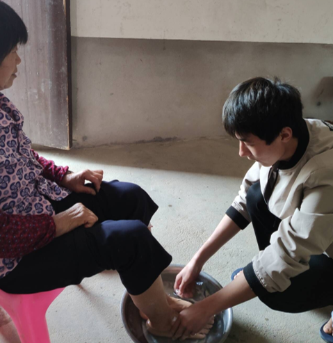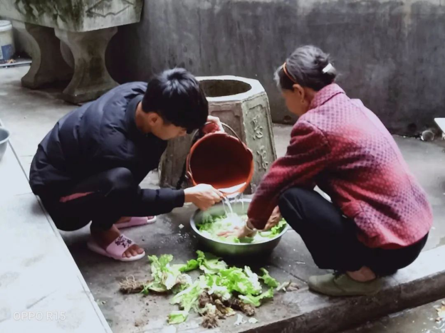 随后,有的志愿者为老人洗脚;有的帮忙晒洗好的衣服;有的在认真打扫卫生;有的帮老人挑水和洗菜。他们辛勤的背影出现在厨房、客厅、院内。