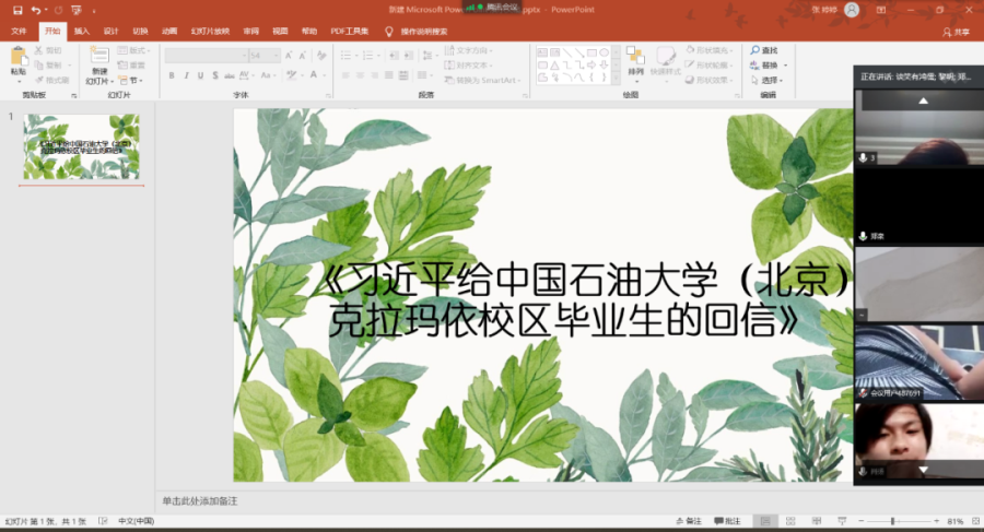 自动化工程系于8月15日通过智慧团建系统里面的团的会议,团的活动模块开展线上主题学习会——“学实录 增力量” ,学习《习近平给中国石油大学(北京)克拉玛依校区毕业生的回信》,总书记的谆谆嘱托,让广大学子倍感振奋,大家纷纷表示,要用实际行动担起时代使命,为中华民族伟大复兴的中国梦矢志奋斗。