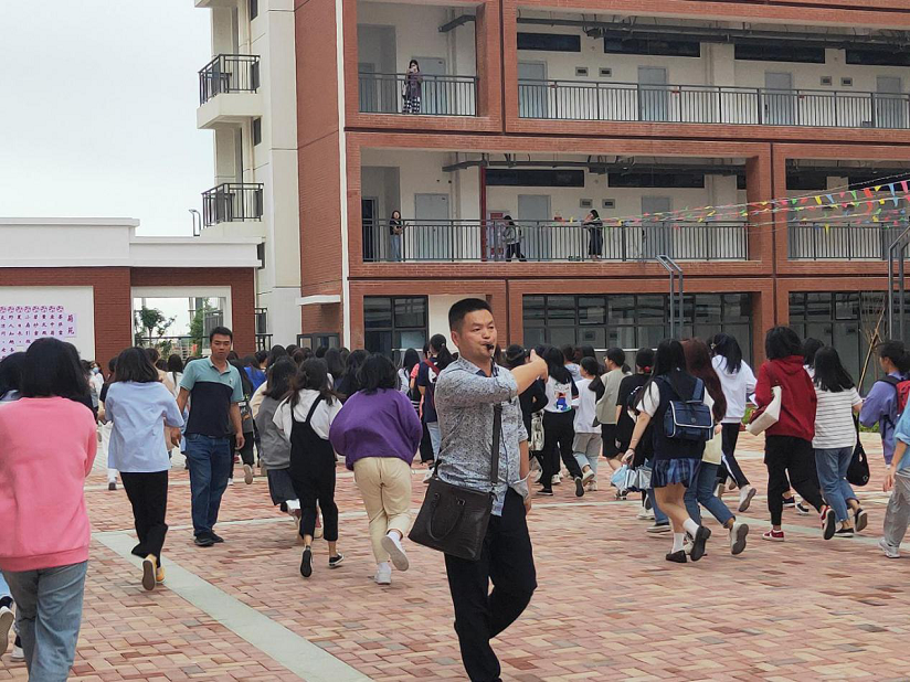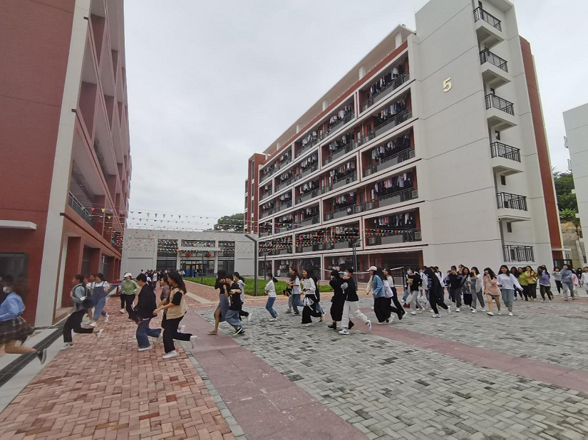 下午14:00警报声准时响起,全体同学们听到“应急疏散警报”信号,立即在安全员朱长山和辅导员陈静宜带领下安全、有序从逃生路线楼梯向下撤离。各楼层学生撤离时进行相对半分开,兰苑前6间往东侧、后6间往西侧有秩序撤离;菊苑前5间往东侧、后5间往西侧有秩序撤离到荔园餐厅南侧广场集中。