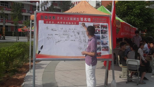 早上8点迎新工作正式开始,各项工作有条不紊地开展了起来。迎新工作人员和学生志愿者们都坚守在各自的报到点上。在各专业报到点,翁娟钗辅导员和学生助理逐一为新生办理入学手续,给新生安排宿舍、引导新生交学费、发放“一卡通”等。值得一提的是为今年特别新生准备的“自动化系2013级新生签名墙”,更是别出心裁的让新生留下他在自动化工程系的第一句话,第一个名字,第一个目标。
