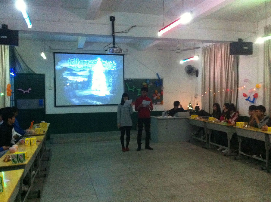 在规定的时间里同学们陆续的来到了会场.领取了平安果静静的等待晚会的开始。盼望着、盼望着,晚会终于来临了。主持人在悠扬的伴奏中致开开幕词,宣布晚会正式开始。首先登场的是部外联部、体育部为我们带来了精彩舞蹈,他们各种各样的动作震惊了整个会场。而微媒体的同学也不甘示弱给我们带来了优美动听的歌曲《十年》唱出了自己的风格。在一轮游戏之后,由宣传部带来的一段精彩哑剧《火车站的故事》他们的神色、动作,表情,把整个会场的气氛推向了高潮,一阵阵掌声随之响起。紧接着在主持人的带领来我们同学写出了了自己对未来的期望。时间过得总是那么的快,不知不觉整个晚会即将接近尾声。最后辅导员对我们的晚会做出了总结,也给我们带来了歌曲《bad boy》为晚会挂上了圆满的句号。