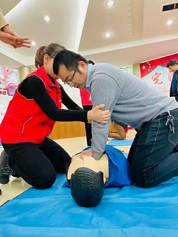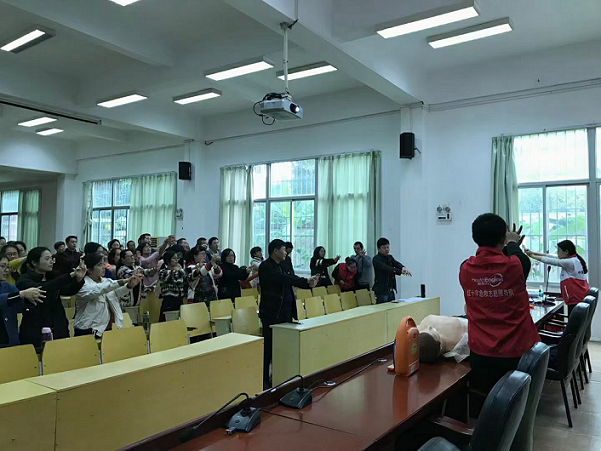 本次培训分为理论学习和实际操作两部分内容,讲座中,老师用理论知识、案例导入和幻灯片相结合的方式,深入浅出地围绕除颤仪、气道异物梗阻、海姆里克急救法、心肺复苏基本技能等进行生动的讲解,并对急救操作过程中的注意事项进行重点强调。在实际操作环节,讲解老师还在现场对心肺复苏的急救知识、如何解除气道梗阻等内容进行了现场演示,并和学校老师开展深入的互动,指导他们进行现场演练,帮助他们在最短的时间内掌握基本的急救技巧,培训效果良好。