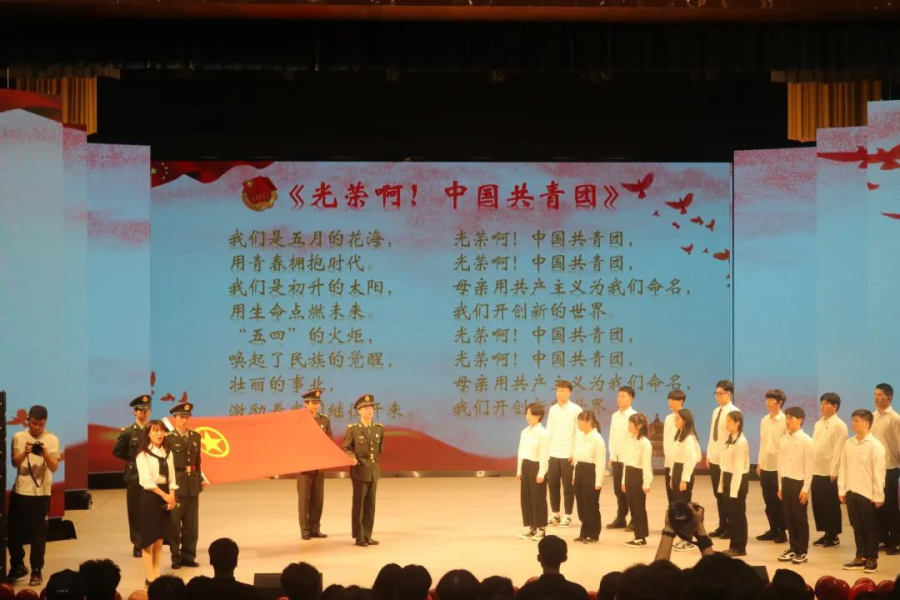 仪式一;出团旗,奏音乐,重温入团宣誓词。由曾瑾老师领誓,全体新团员以及全体师生起立,右手握拳,举至右耳根,以最洪亮的声音,面向鲜艳的团旗庄严宣誓。从这一刻起,新团员们正式成为了一名中国共产主义青年团团员,他们在感受着无上光荣的同时,也肩负着更重的责任和使命。为今后的学习和生活不断努力,无悔于此刻的庄严宣誓。