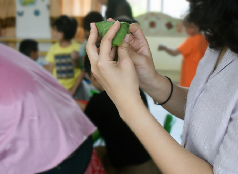 随后,陈满红书记带着同学们一起亲自动手,学习包粽子。孩子们兴奋地围在奶奶们身边学着包粽子的手法:一折叶、二盛料、三压实、四包、五扎绳。看似简单,但要做个漂亮的粽子还是需要一点功夫的,在我们的共同努力下,蜜枣粽出笼啦!虽然包出来的粽子大小不一、形状各异,但是大家都沉浸在自己动手的欢乐中。
