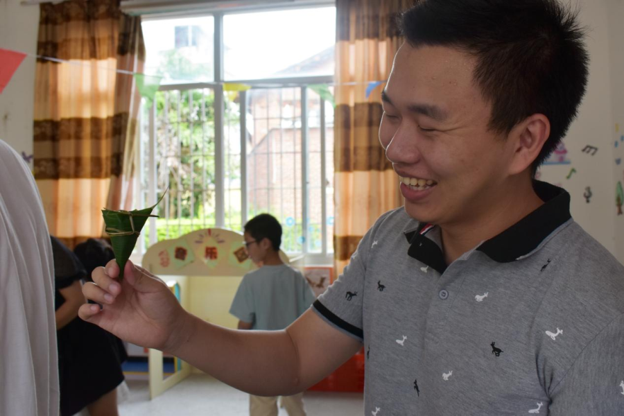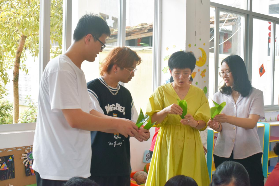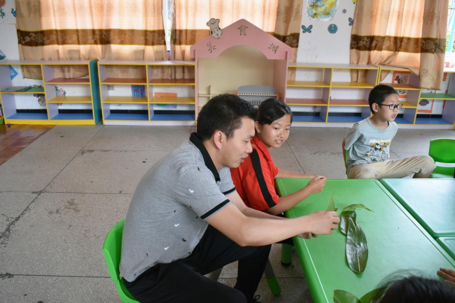 组织员杨娴、辅导员朱长山、陈静宜老师和孩子们围坐在一起,现场指导孩子们如何包粽子。