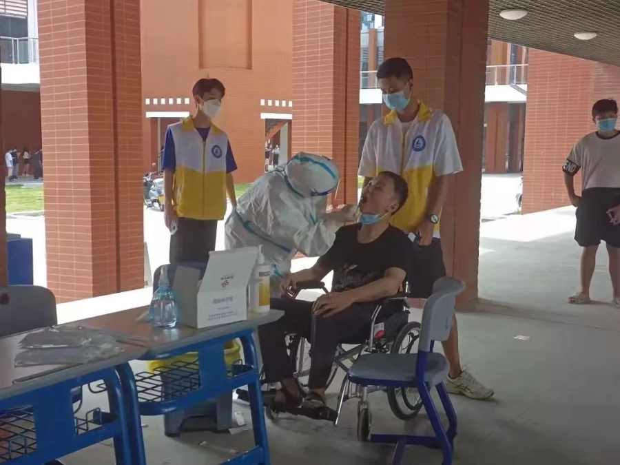 在这场没有硝烟的战场上活跃着一抹亮丽的黄色,他们就是电子工程系学生志愿者。他们在辅导员老师的带领下有序组织学生进行核酸检测,精心照料行动不便的学生,确保全员检测到位;他们顶着烈日为健康观测点的同学送水、送餐、搬运物资等,以一己之力,闪耀青春最美的模样。