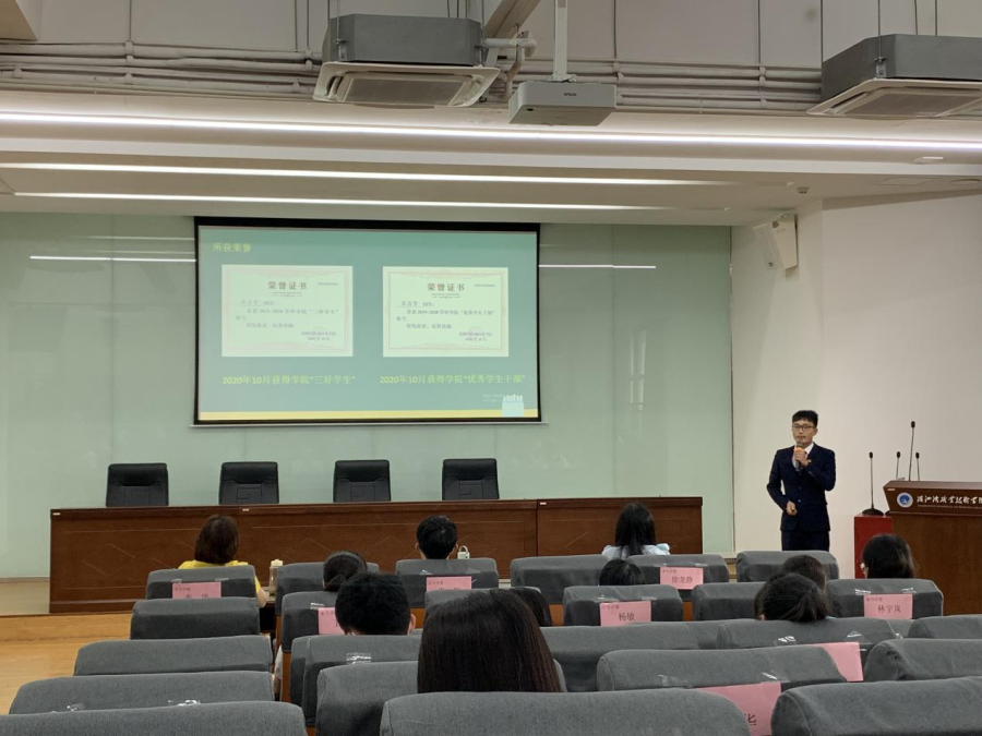 评比过程中,张慧贤提到在他成绩和荣誉的背后,是学校的发展给我创造的良好条件,是老师的悉心指导与同学的鼓励帮助为他提供动力,感谢我系的各位老师,是老师们给予我谆谆教导,助自己更上一楼,并且自己也将会努力朝着更好的方向发展,以梦为马,不负韶华!