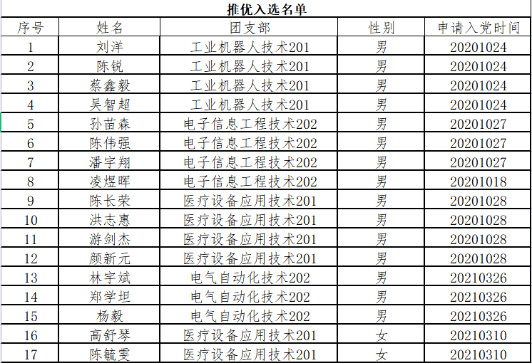 团支部推优大会流程结束,共有17位入党候选人,电子工程系分团委公布根据投票结果公示本期入党推优名单。